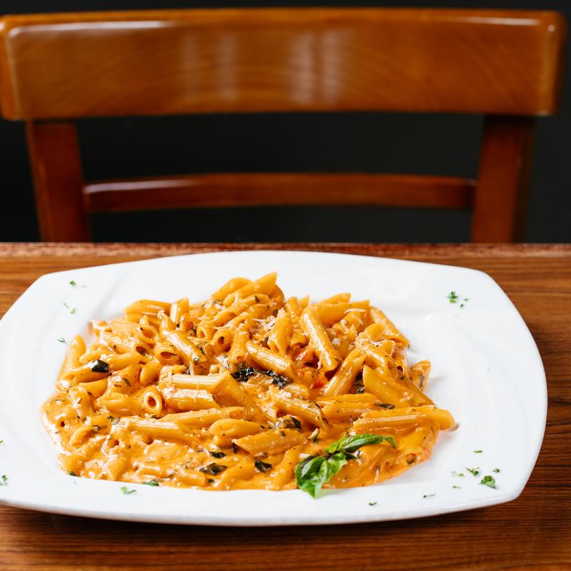 Chicken, Mushrooms, Red Peppers, Onions, Jalapeños, in a Creamy Pink Penne Sauce